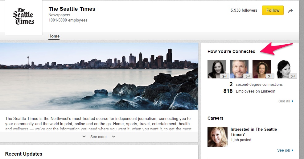 When you apply for a job, research the company on LinkedIn, and be sure to connect with the hiring manager or recruiter. For example, if you were applying for a job with The Seattle Times you will want to go to their LinkedIn Company Page and then click on, "How You’re Connected."